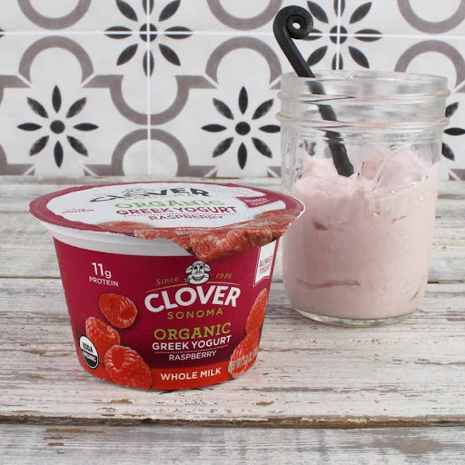Clover Sonoma Contains Dairy Yes Contains Milk Yes Pricing Unit of Measure CS Primary Unit of Measure PC Shelf Life 30 Size 632 OZ BC Storage Type REF. Made with organic whole milk Clovers Organic Raspberry Greek Yogurt cups are smooth tangy and packed with 11 g of protein. The natural flavor of our creamy nutritious yogurt gives you a delicious healthy start to your day.